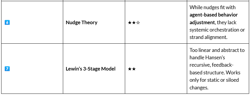 - Lewin and Nudge models fall short under Hansen’s structure due to their lack of complexity handling and low scalability.