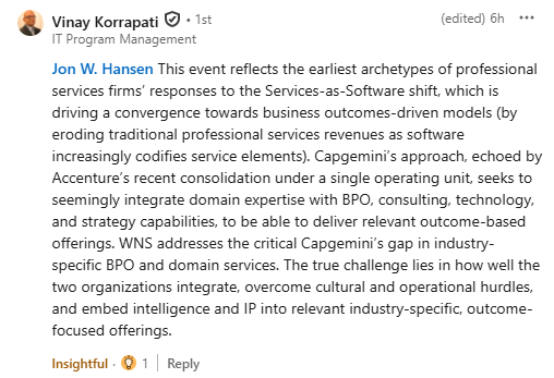 - Complementary capabilities: Capgemini’s consulting + WNS’s operational excellence