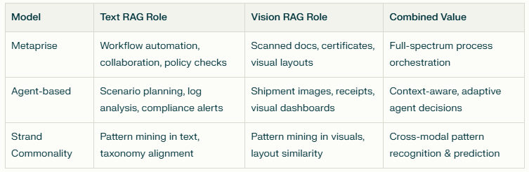 The Hansen Fit Score’s Metaprise, Agent-based, and Strand Commonality models use both Text RAG and Vision RAG to create a holistic, adaptive, and future-proof procurement analytics and decision-making framework. By leveraging both modalities, these models ensure that no critical information—whether textual or visual—is overlooked, enabling more accurate, resilient, and strategic procurement operations in an increasingly complex world.