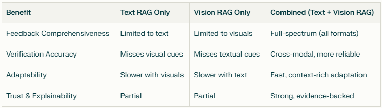 - Vision RAG supports the verification of outputs by enabling the system to “see” and cross-check against visual evidence, reducing the risk of undetected errors.