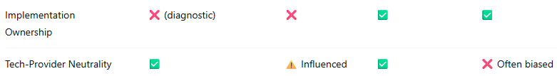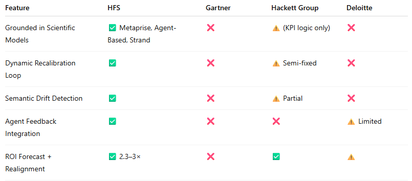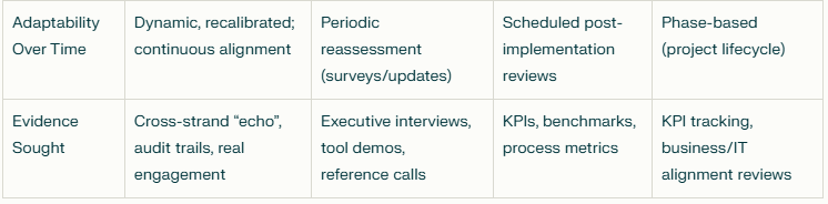 By contrast, Gartner and The Hackett Group focus heavily on initial selection, benchmarking, and executive-level KPIs, with reassessments on a periodic or scheduled basis. Deloitte provides the most hands-on, holistic consulting solution, but recalibration of fit is typically bound to project stages and not a persistent, real-time adjustment mechanism.