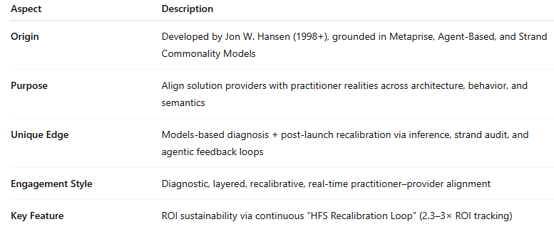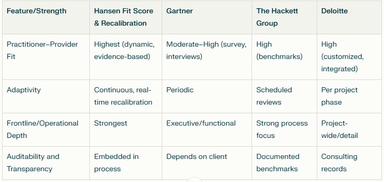 The Hansen Fit Score with recalibration distinguishes itself by providing continuous, operationally-validated alignment between practitioner needs and provider delivery, with evidence-based, organization-wide diagnostics and proactive recalibration that extend beyond initial go-live. It directly measures whether intended benefits “echo” through real operational systems, surfacing drift and addressing it dynamically.