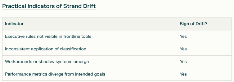 Strand Drift is the silent migration or dissipation of strategic intent and rules as they move from the executive level down to the operational frontlines. Detecting and remedying Strand Drift is essential to ensuring that organizational initiatives remain aligned, effective, and impactful throughout the enterprise.