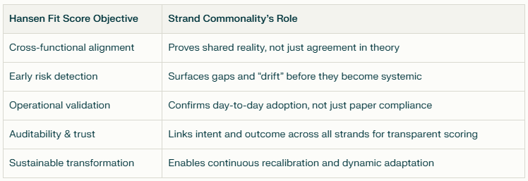 Strand Commonality is fundamental to the Hansen Fit Score because it turns alignment from an executive aspiration into an operational reality. It ensures that integration, adoption, and value are not merely declared—they are proven present through objective evidence across all organizational “strands.” Without strand commonality, the Fit Score would be limited to assessing intentions rather than outcomes, losing its unique power as an instrument for real, sustainable transformation.