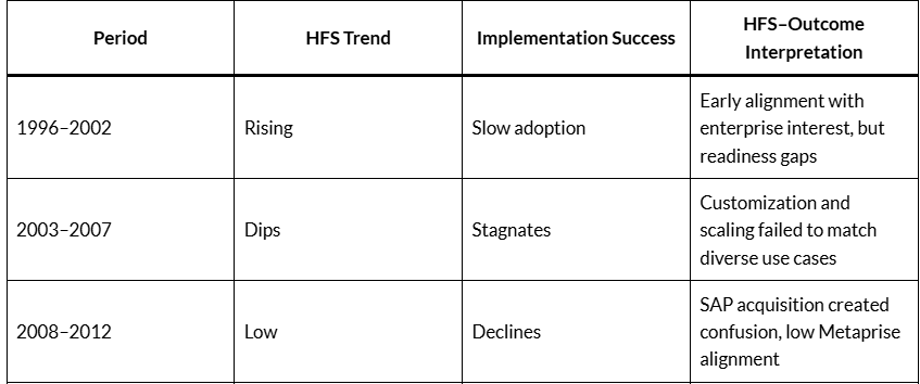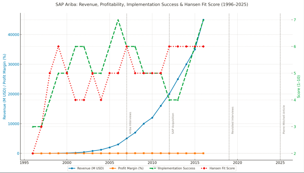 The relationship between the Hansen Fit Score (HFS) and SAP Ariba’s implementation success is direct and diagnostic: fluctuations in implementation success across the 1996–2025 timeline track closely with the HFS curve, revealing how alignment—or misalignment—with Hansen’s Metaprise, Agent-Based, and Strand Commonality models predicts real-world outcomes.