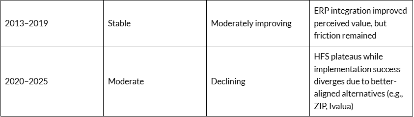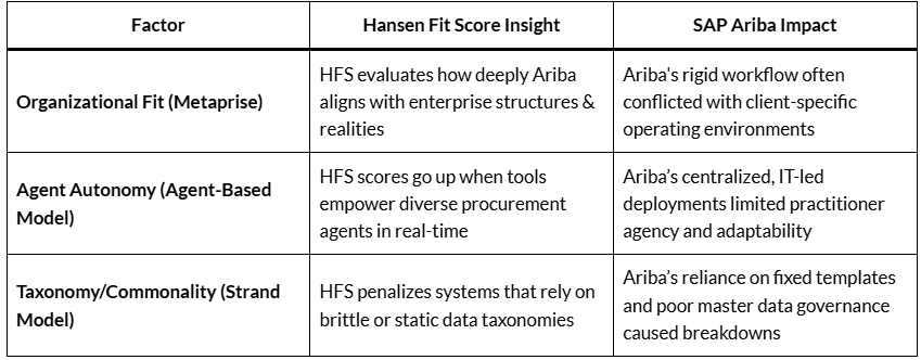This validates that HFS functions as both a predictive score and a recalibration signal. Ariba’s limited adaptability to heterogeneous procurement environments—despite strong brand strength—reduces long-term success when it fails to align with the agent-specific realities of practitioner organizations.