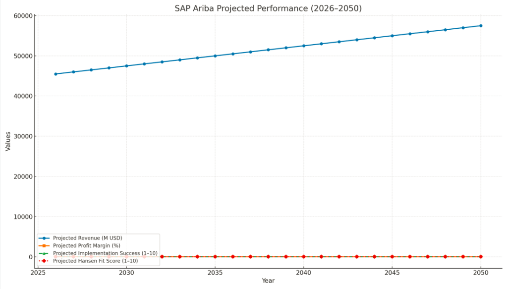 The sharp contrast between SAP Ariba’s revenue line and the flatter, lower curves for profit margin, implementation success, and the Hansen Fit Score reveals a classic enterprise tech paradox in the ProcureTech world. Let’s break it down: