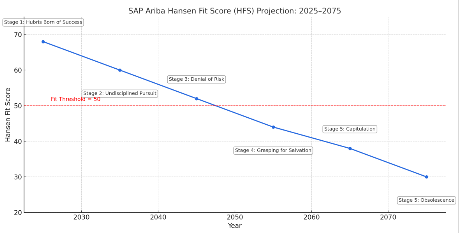 SAP Ariba’s 2025 HFS is estimated at 85/100, reflecting its current strength but early hubris. Over 50 years, the score is projected to decline significantly—reaching 68-72.25 by 2035, 46.75-55.25 by 2045, 29.75-42.5 by 2055, 17-34 by 2065, and 0-21.25 by 2075—driven by a 65-75% vulnerability increase. This decline underscores the risk of losing focus and adaptability, offering a cautionary tale against the establishment’s overconfident narrative.