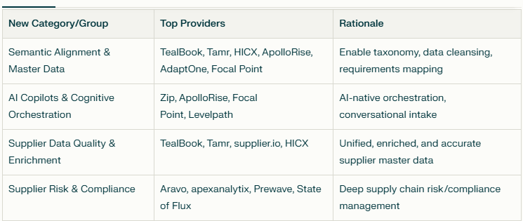 - New categories and dual-listings better reflect the 2025 reality and practitioner priorities (semantic fit, AI-driven orchestration, integrated risk).