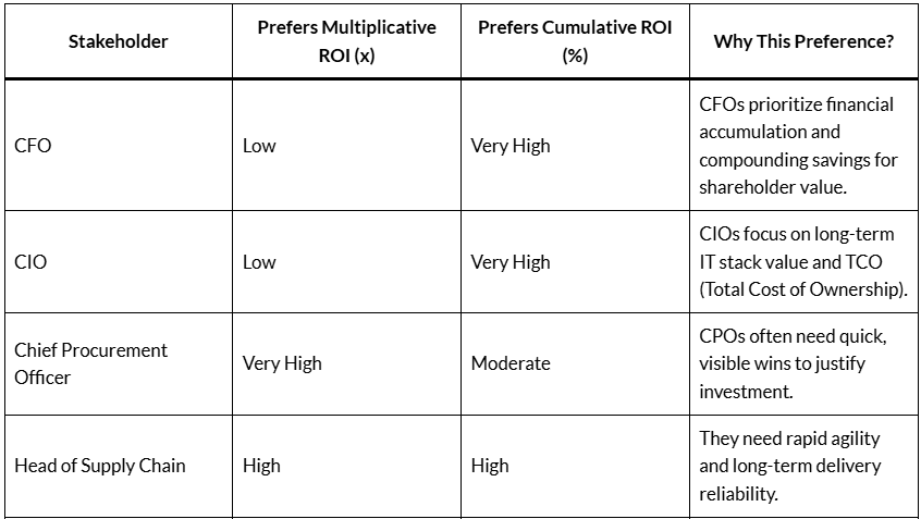 Here is the Stakeholder Preference Chart, which shows which stakeholder groups prefer Multiplicative ROI (e.g., “x-fold” returns over short cycles) versus Cumulative ROI (e.g., long-term value compounding over time).