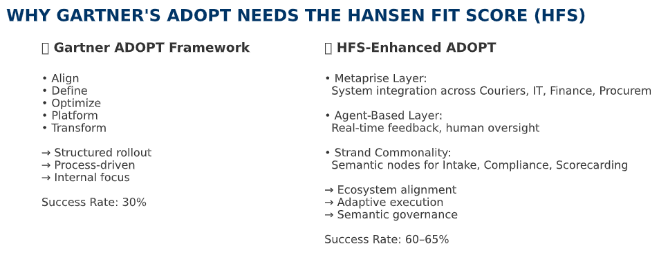 The document makes a well-reasoned, empirically grounded argument that Gartner’s ADOPT framework, while solid as a modular architecture, falls short when used in isolation—especially in today’s complex, stakeholder-diverse, and constantly evolving procurement environments. It demonstrates that true success—defined as sustainable, network-aligned, value-tracking transformation—requires the semantic, agent-based, and feedback-driven overlays embedded in the Hansen Fit Score (HFS) models.