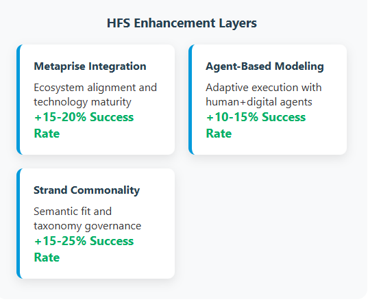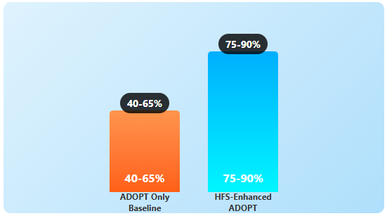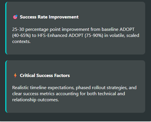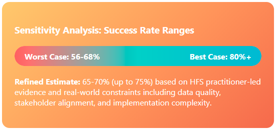 The visual representation shows a success rate progression from 30% (baseline) to 75% (HFS-Enhanced ADOPT high), with the refined range at 65-70%. Sensitivity analysis indicates a ±5-7% variation, driven by infrastructure, alignment, effort, and data quality, with a best-case scenario of 80% and a worst-case scenario of 56-68%. This balanced estimate leverages HFS’s fit and ADOPT’s structure, offering a practical alternative to the establishment’s tech-centric bias.