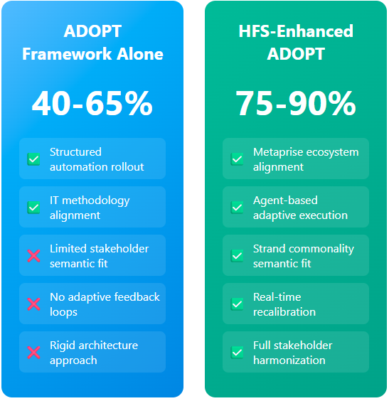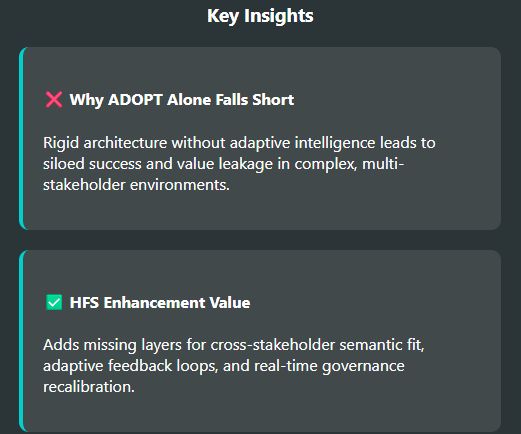 In complex, multi-party ecosystems (suppliers, couriers, execs), this rigidity leads to siloed success or value leakage over time. That’s consistent with independent industry data showing ~40–65% success when ADOPT is applied alone.