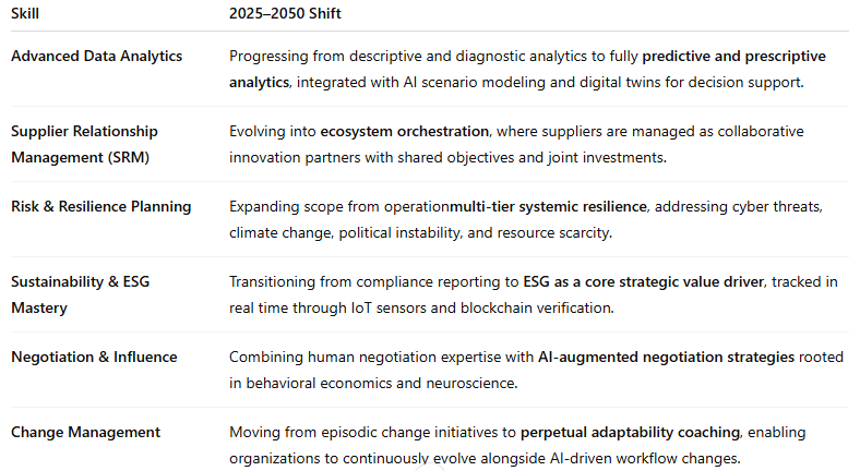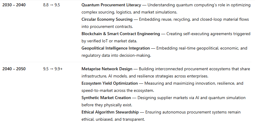 If we frame this through the Hansen Fit Score (HFS) lens, skills will evolve alongside procurement’s maturity from strategic function (HFS ~8.3 in 2025) to a fully adaptive, ecosystem-aligned discipline (HFS ~9.9–10 by 2050).
