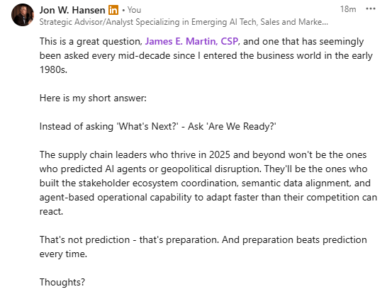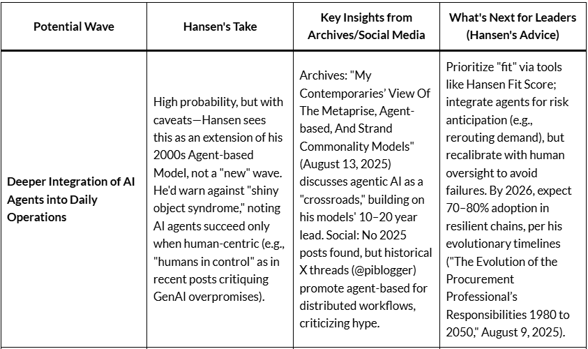 Hansen would conclude that the “next wave” for supply chain leaders isn’t one trend but a synthesis: Deeper AI agent integration (his top pick, at ~65% emphasis based on recent archives) tempered by sustainability and geopolitical realities, with the unexpected always looming. Drawing from his 40+ years of experience (e.g., 1998 RAM influencing modern AI), he’d advise leaders to “walk softly” beyond 2025—using fit models to prioritize people/process over technology, avoiding redundant investments. This aligns with his blog’s 2025 focus on AI reality checks and social media’s historical emphasis on visionary yet practical strategies. If engaging directly, he’d invite dialogue: “What’s your take—hype or real transformation?”