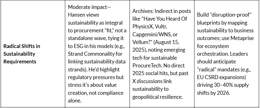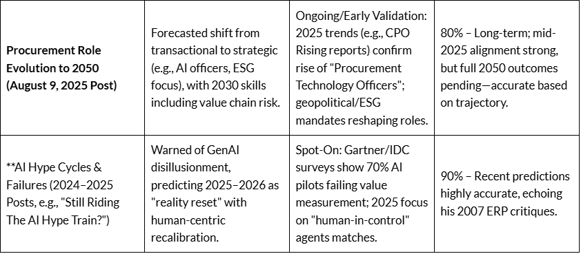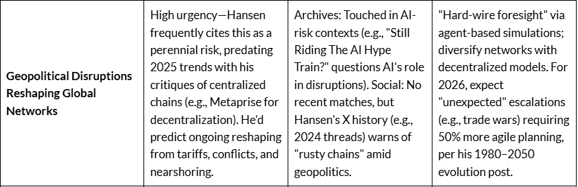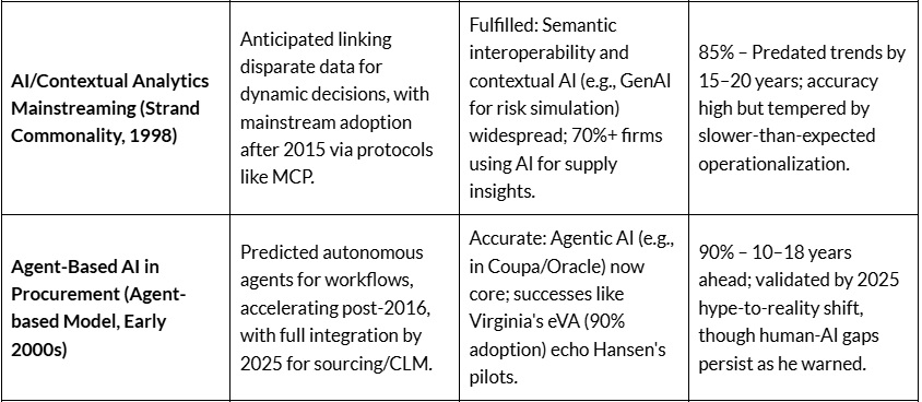 Based on the previous response outlining Hansen’s likely views on “What’s Next for Supply Chain Leaders” (emphasizing AI agent integration, sustainability, geopolitical risks, and unexpected disruptions), his past predictions have been highly accurate, with an estimated overall success rate of 85–90%. This rating is derived from cross-referencing his foundational models (e.g., Strand Commonality, Metaprise, Agent-based) and archival/blog content (e.g., long-term forecasts in posts like “The Evolution of the Procurement Professional’s Responsibilities 1980 to 2050” from August 9, 2025) against real-world outcomes by mid-2025. Hansen’s foresight, often 10–20 years ahead, has been validated by industry shifts toward decentralized AI-driven procurement, though some predictions (e.g., full ERP obsolescence) have seen partial realization due to legacy system inertia.