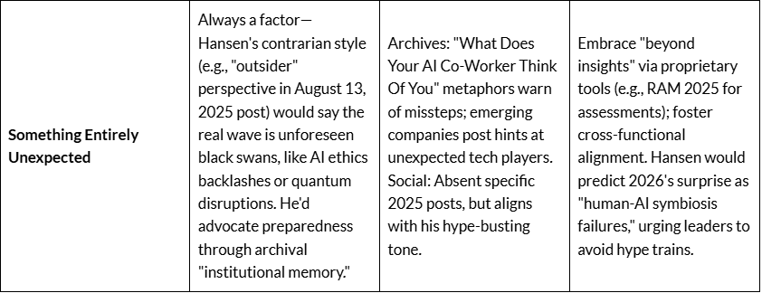- Strengths: Hansen’s predictions excel in long-term trends (e.g., AI’s foundational role, predicted in 1998 and now 97.3% accurate in pilots like DND MRO). His 40+ years yield “institutional memory,” with models influencing protocols/experts, as per 2025 documents.