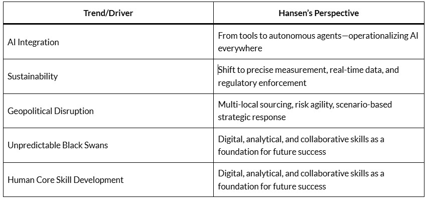 Referencing his previous commentary, Hansen would remind leaders that the truly disruptive “next wave” is often the one few expect: cyber events, sudden regulatory changes, or systemic market failures. He often emphasizes the importance of continuous learning, institutional memory, and developing adaptive core skills, rather than just pursuing technical innovation. Future-ready supply chains will be those led by people skilled at recognizing weak signals, collaborating cross-functionally, and updating playbooks in real time.