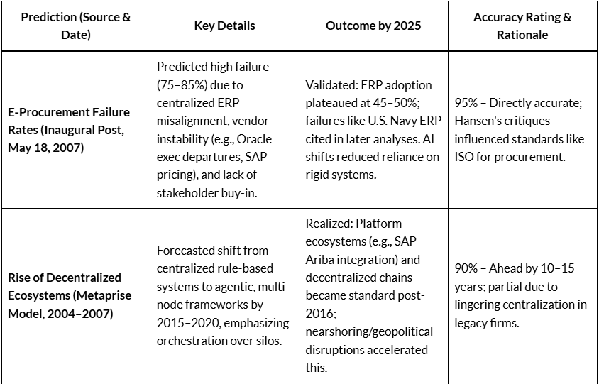 Hansen’s accuracy stems from his practitioner-rooted, contrarian approach—focusing on human-process alignment over hype—which has allowed him to anticipate failures (e.g., 75–85% e-procurement flop rates in 2007) and successes (e.g., the mainstreaming of agentic AI post-2015). While no comprehensive third-party audits exist (searches yielded no direct “accuracy reports”), his models are cited as “seminal” in 2025 analyses, with high accuracy in trends such as AI adoption and supply chain resilience. Below is a table of key historical predictions, their outcomes, and an evaluation of accuracy, based on archival evidence and industry validation.