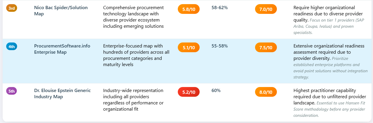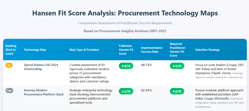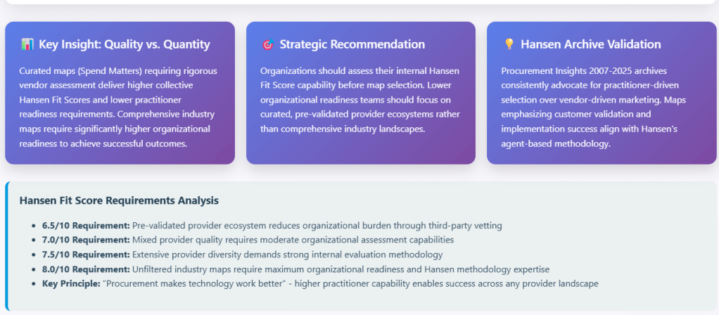 Quality-curated maps reduce implementation risk. The data show an inverse relationship: higher map curation quality corresponds to lower practitioner readiness requirements. Spend Matters’ rigorous vendor vetting delivers 68-72% success rates with only 6.5/10 practitioner requirements, while comprehensive industry maps require 8.0/10 capability for comparable outcomes. Hansen’s principle, “procurement makes technology work better,” means choosing maps aligned with your organizational sophistication.
