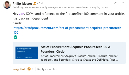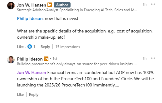 It is through this comprehensive and all-encompassing lens that I will provide this Model 1/Level 1 assessment of the Art of Procurement (AOP) acquisition of the ProcureTech 100 and Founders Circle per Philip Ideson’s comment in an earlier post on LinkedIn. For the record, here is the comment exchange: