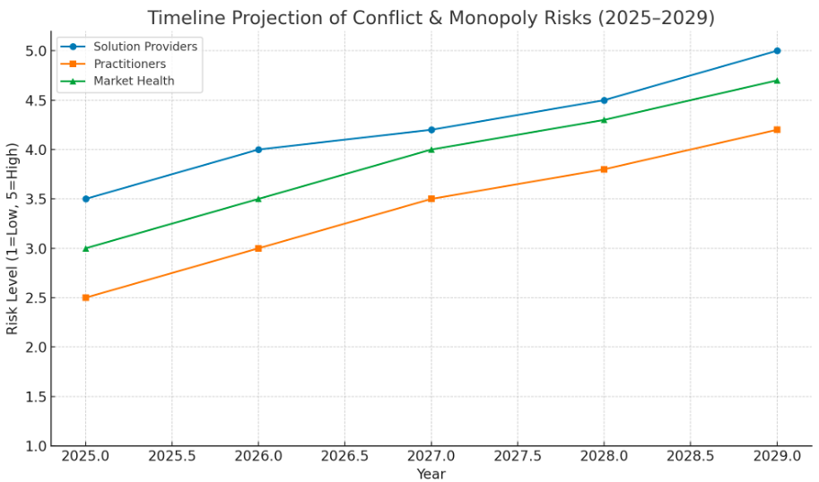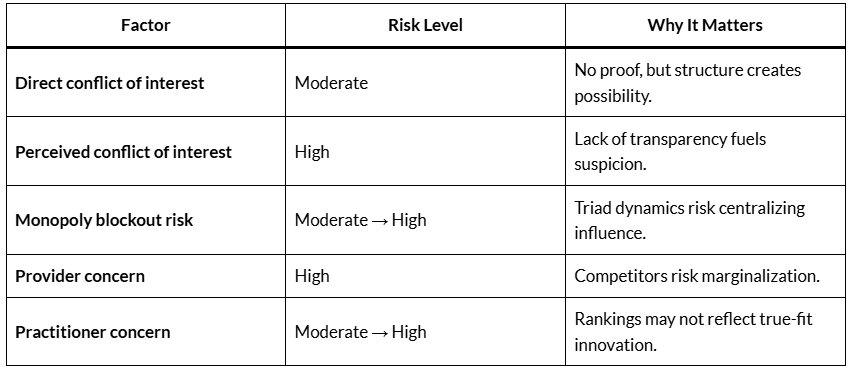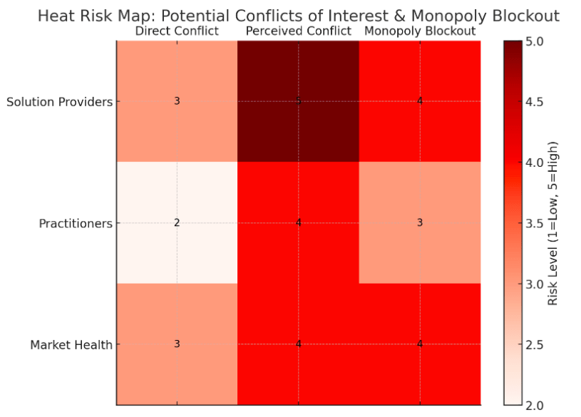 Bottom line: Both solution providers and practitioners should be alert. While no explicit misconduct is proven, the optics of overlap and concentration of influence create a high perception risk and a moderate-to-high structural risk of conflicts or blockouts. The industry should push for greater transparency and independent governance to ensure trust.