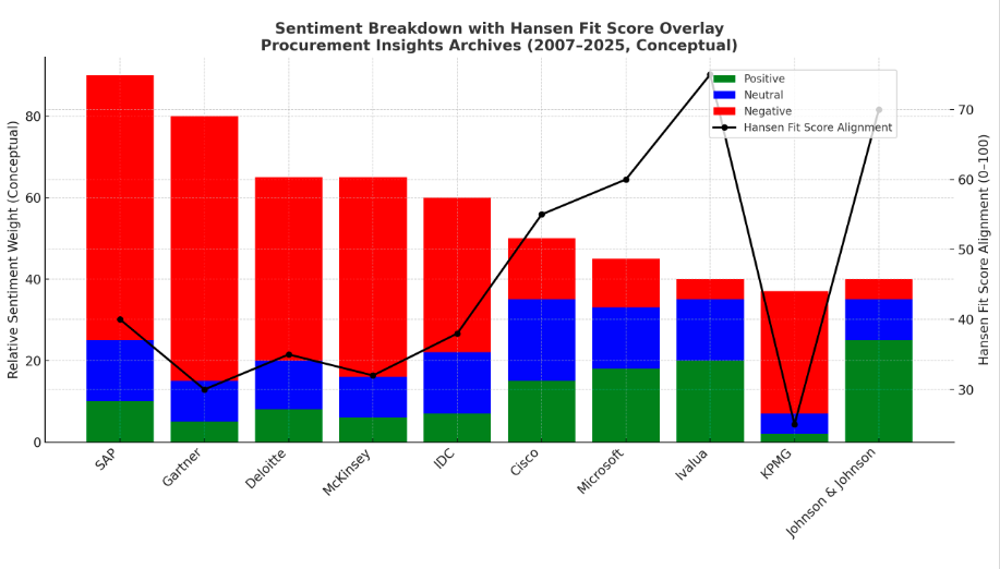 Takeaway: Hansen’s independent critique favors innovators and practitioners (Ivalua, J&J) while showing skepticism toward established vendors and analyst/consulting giants (SAP, Gartner, KPMG, Deloitte, McKinsey).