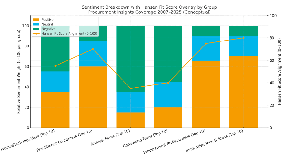 Here’s the sentiment + Hansen Fit Score overlay by group (Procurement Insights coverage 2007–2025).
