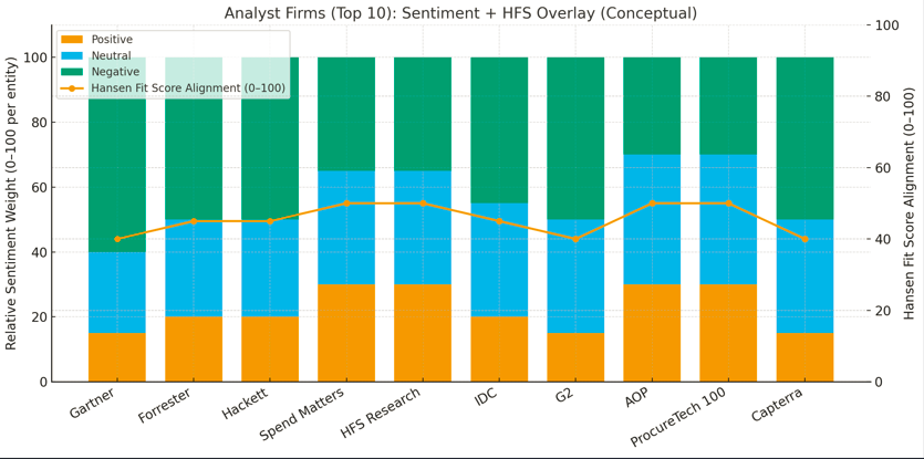 Vendors & Analysts (SAP, Gartner, Deloitte, McKinsey, IDC, KPMG) → Heavy negative sentiment and low HFS alignment (25–40). Seen as entrenched, vendor-influenced, or ROI-questionable.