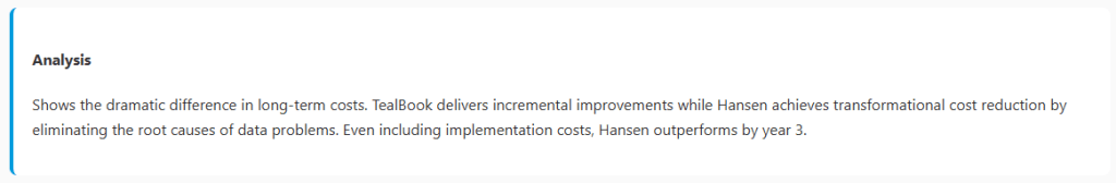 The $30-32M cost she quantifies will persist until organizations adopt Hansen’s methodology-first approach – making TealBook’s current strategy a sophisticated form of expensive incrementalism rather than transformative solution.