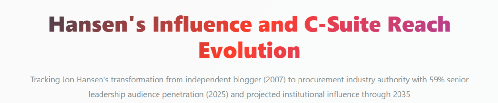 The LinkedIn demographics validate Hansen’s transformation from independent blogger to industry authority commanding C-suite attention globally. This foundation supports both Procurement Insights’ positioning as “institutional memory” and Hansen Fit Score’s potential as the independent alternative to vendor-influenced analyst frameworks. The key to continued growth lies in preserving the independence that attracted this premium audience while scaling through controlled partnerships and certification programs.