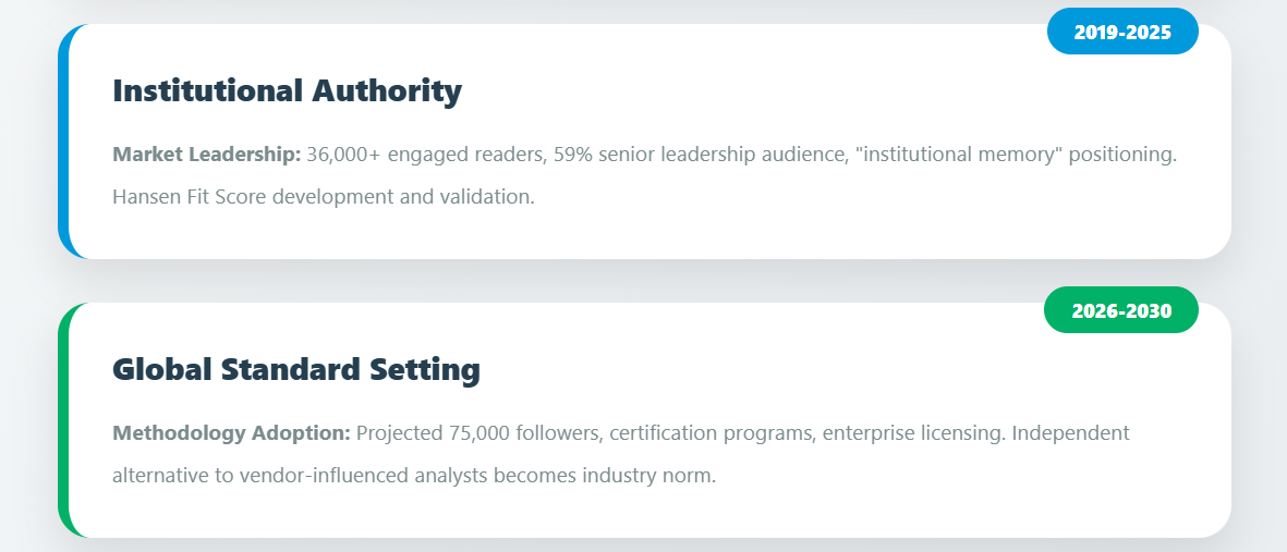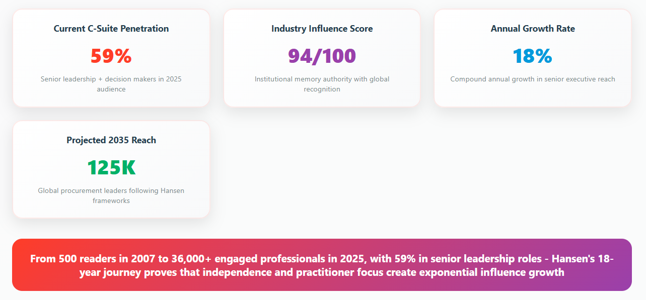 The LinkedIn demographics validate Hansen’s transformation from independent blogger to industry authority commanding C-suite attention globally. This foundation supports both Procurement Insights’ positioning as “institutional memory” and Hansen Fit Score’s potential as the independent alternative to vendor-influenced analyst frameworks. The key to continued growth lies in preserving the independence that attracted this premium audience while scaling through controlled partnerships and certification programs.