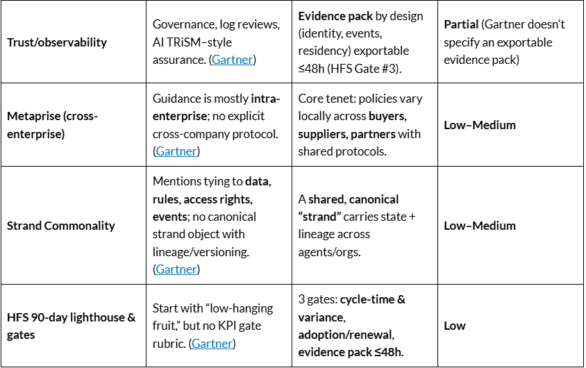 Gartner’s 2025 work clearly embraces agentic oversight, which Hansen has advocated since the late 1990s in procurement. The ideas rhyme, but the Gartner materials don’t show the strand/evidence-pack mechanics or the cross-enterprise metaprise scope that are distinctive to Hansen. Without documentary evidence, the fair characterization is strong conceptual convergence, not a claim of copying.