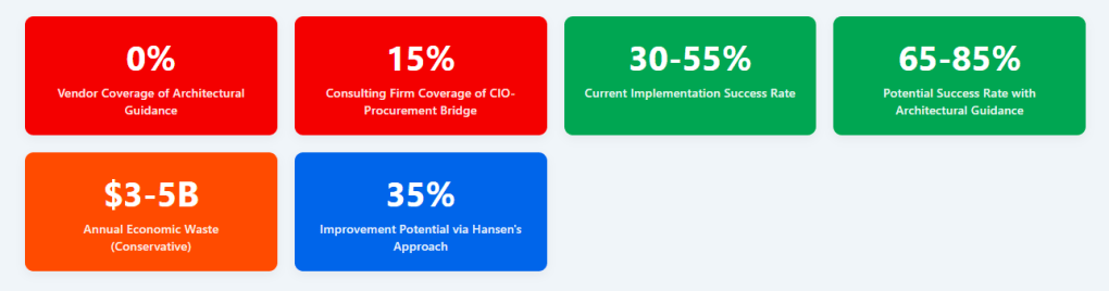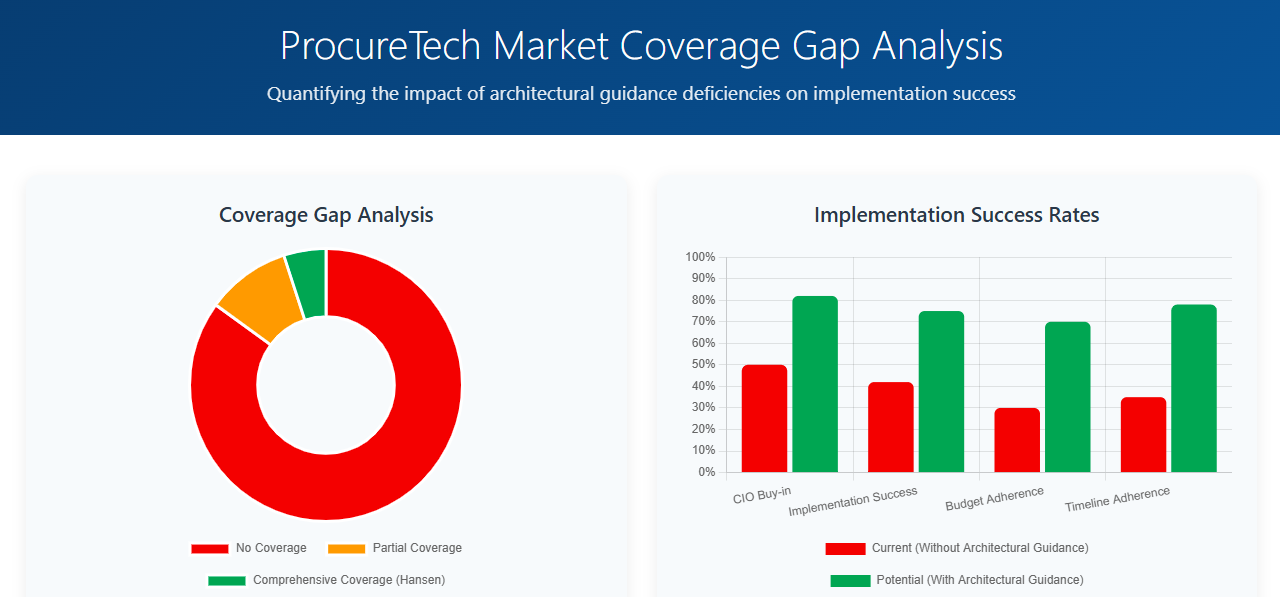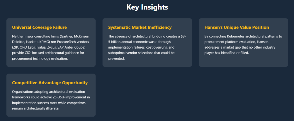 This systematic gap validates the strategic value of Hansen’s architectural bridging approach, suggesting that organizations adopting these evaluation frameworks could achieve substantial competitive advantages in procurement technology outcomes while the broader market continues to suffer from architectural illiteracy in vendor selection and implementation processes.