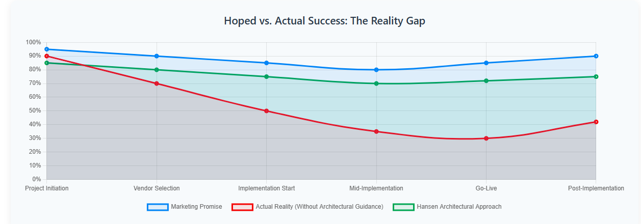 The most revealing chart shows how marketing promises consistently outpace actual delivery throughout the project lifecycle. Hansen’s architectural approach maintains more realistic and sustainable success trajectories.