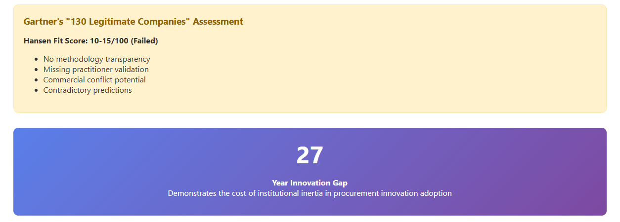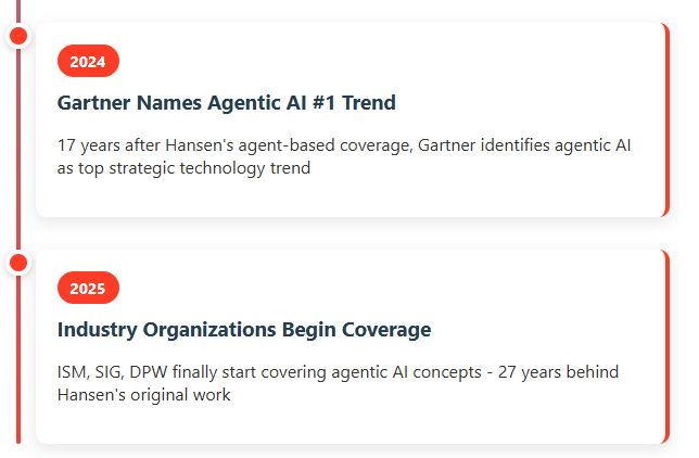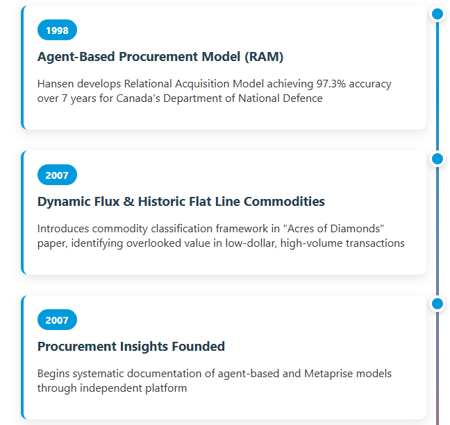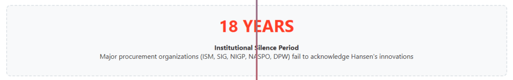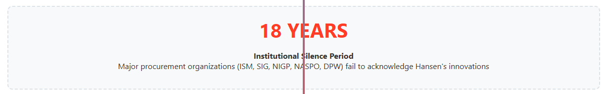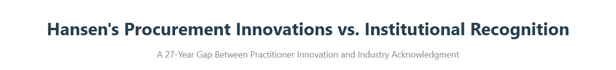 The irony is that this prescient analysis went largely unrecognized by major procurement organizations (ISM, SIG, NIGP, etc.) for over a decade, validating Hansen’s critique of institutional inertia in the procurement field.