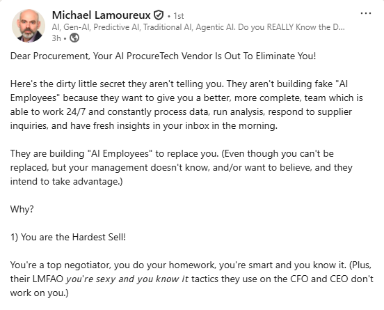 However, your audience analysis may be flawed. The procurement professionals responding to Michael’s post appear to be seeking immediate defensive strategies against perceived AI threats, not comprehensive transformation methodologies.