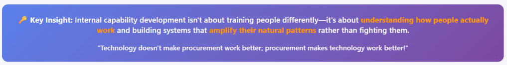 Hansen explicitly states: “Technology doesn’t make procurement work better; procurement makes technology work better!” – reinforcing your argument that organizations consistently choose ***technological shortcuts over developing internal capabilities.