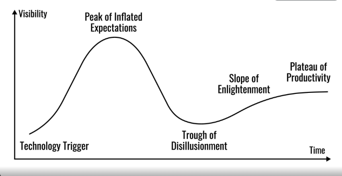 - Trough of Disillusionment: As initial failures and challenges emerge, the hype fades, and interest wanes. Many technologies “fizzle” at this stage because they can’t deliver on their promises.