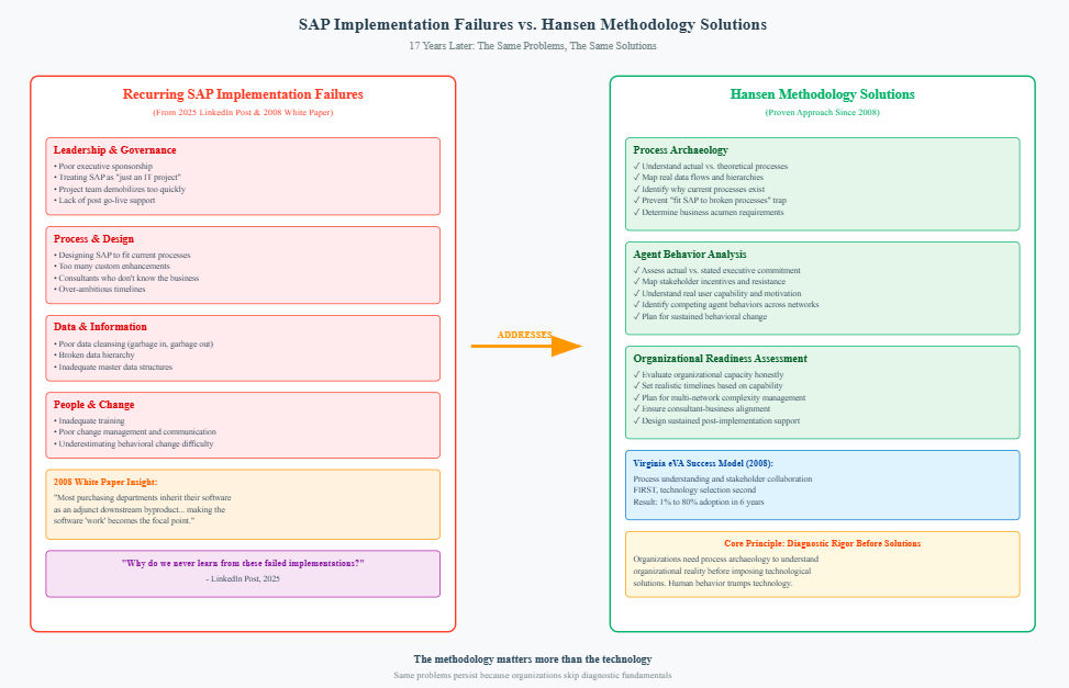 Mike George’s LinkedIn post perfectly captures the central thesis of my 2008 SAP white paper – that implementation methodology matters more than the technology itself. The post’s litany of failures demonstrates exactly what I warned about: organizations focusing on technology while ignoring the human, process, and organizational factors that determine success.