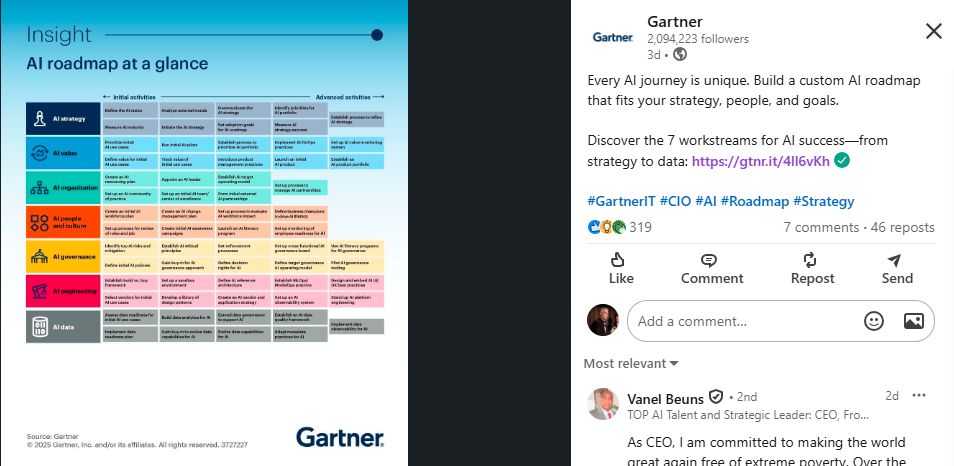The following is a 6 MODEL/Level 1 Assessment Summary of the viability of the above Gartner AI roadmap at a glance.