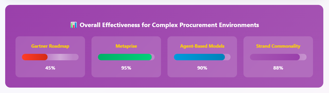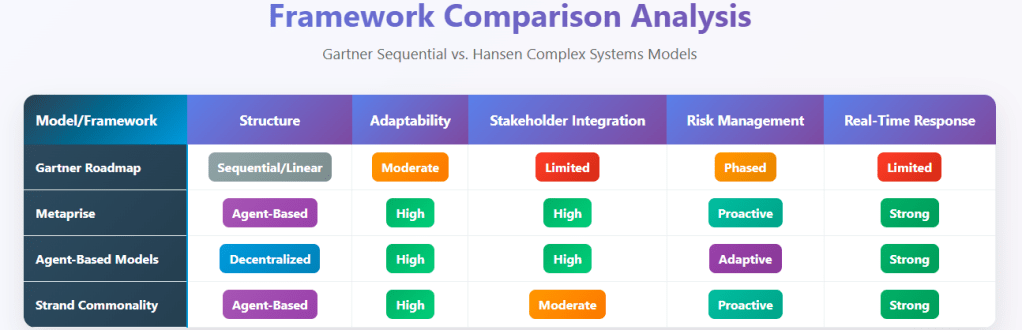 The Gartner roadmap’s sequential structure is not sufficient for complex, agent-driven environments like procurement and supply chain. Agent-based, Metaprise, and Strand Commonality models are required to capture and manage the adaptive, emergent, and interconnected realities of large-scale transformation. Static roadmaps miss the very factors that matter most for sustainable change.
