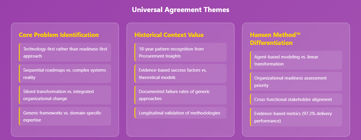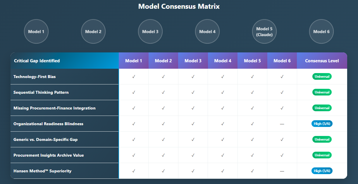 - Nearly all model assessments agree the CFO article suffers from classic technology-first bias. It emphasizes digital tools, AI, and sequencing roadmaps before diagnosing organizational readiness, behavioral patterns, or incentive alignment—a central critique documented in Procurement Insights archives for nearly two decades.