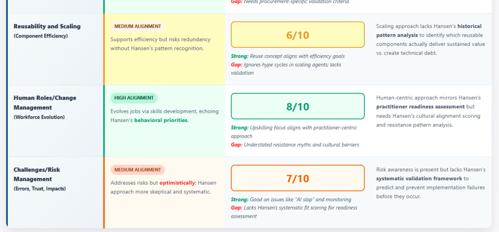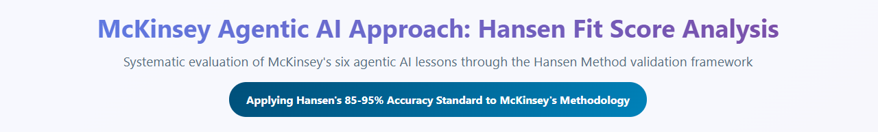 The Hansen Fit Score’s specific contribution is its ability to transform McKinsey’s qualitative lessons into measurable metrics that can guide implementation and improvement. By quantifying concepts like trust, oversight effectiveness, and workflow integration, the Hansen methodology provides actionable data for organizations implementing agentic AI solutions.