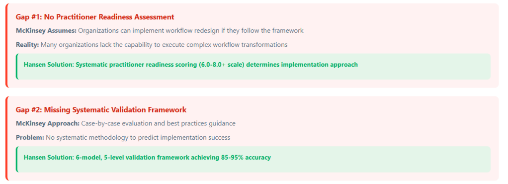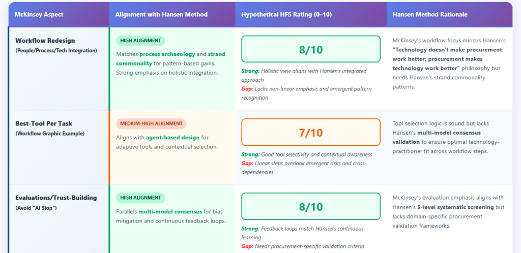The McKinsey chart is a strong endorsement and mainstreaming of key Hansen Method principles: right tool for the task, workflow-first, pragmatic orchestration. Its main remaining gap is its reliance on static mapping versus live practitioner analysis and ongoing fit validation—ground that the Hansen Fit Score continues to own.