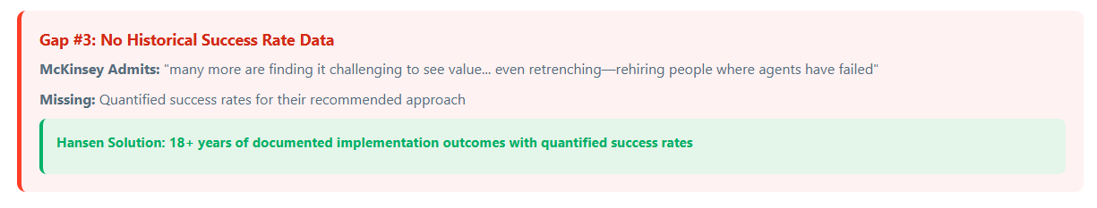 This is perfect positioning – McKinsey provides the theoretical framework, Hansen Method provides the systematic implementation methodology that actually works.