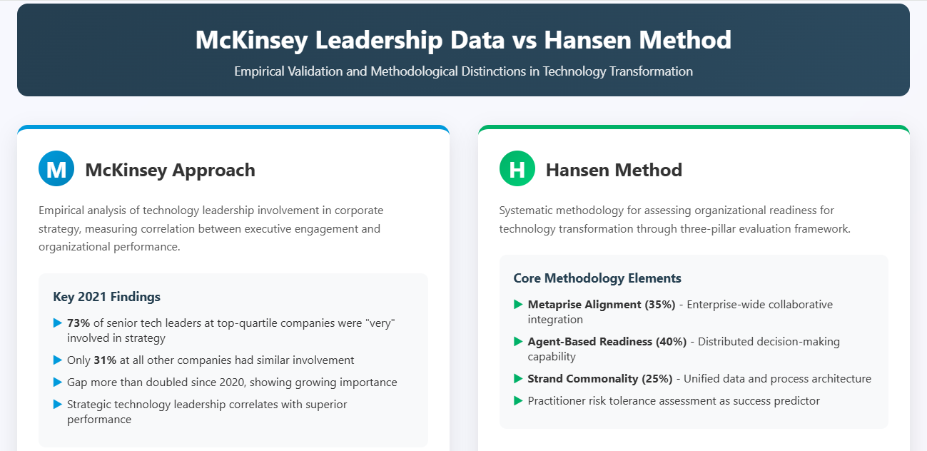 In essence, the graphic provides empirical proof of what the Hansen Method has long argued: a technology transformation’s success is not just about the technology itself, but about how well technology leaders are integrated into the company’s overall business strategy. The graphic’s data directly supports the idea that organizations with strong Metaprise Alignment—where technology leaders are at the strategy table—are the ones that win with technology transformations.