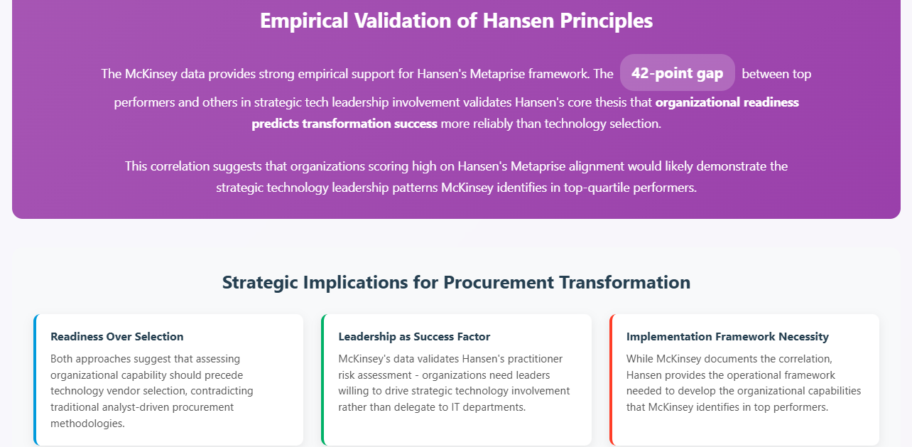 This finding aligns directly with the Hansen Method’s concept of Metaprise Alignment. The Hansen methodology views the enterprise not as a collection of siloed departments but as a “collaborative enterprise web” where different functions—like IT, finance, and procurement—are interconnected nodes.