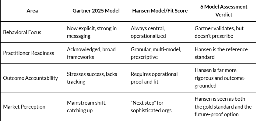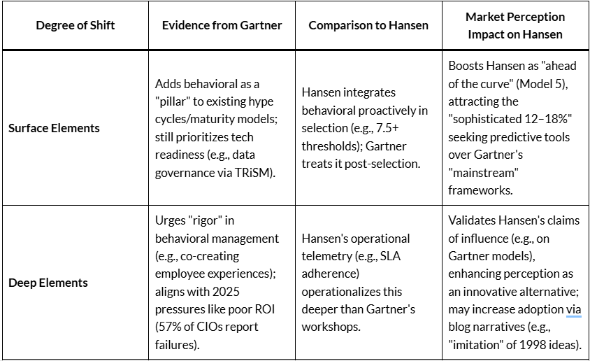 - Surface Change: Gartner’s approach remains fundamentally “technology-first”. It treats behavioral factors as an “added” consideration rather than the primary selection criteria, and it provides broad, descriptive frameworks rather than the specific, predictive, and prescriptive methodologies of the Hansen Fit Score. Gartner is “documenting a problem that the Hansen Fit Score was designed to solve” without fully adopting the solution.