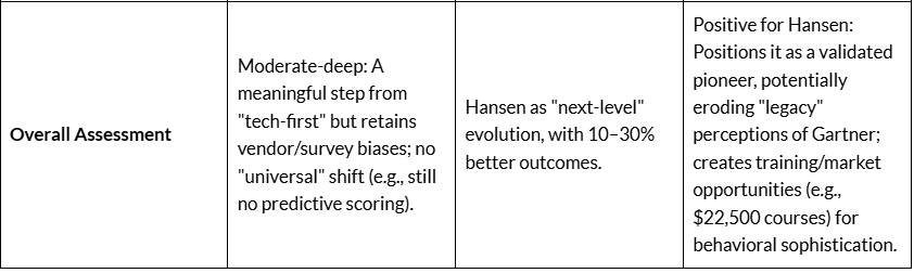 This behavioral outcomes inclusion represents meaningful rather than surface-level change in Gartner’s methodology, with profound implications for Hansen’s market positioning and business strategy.